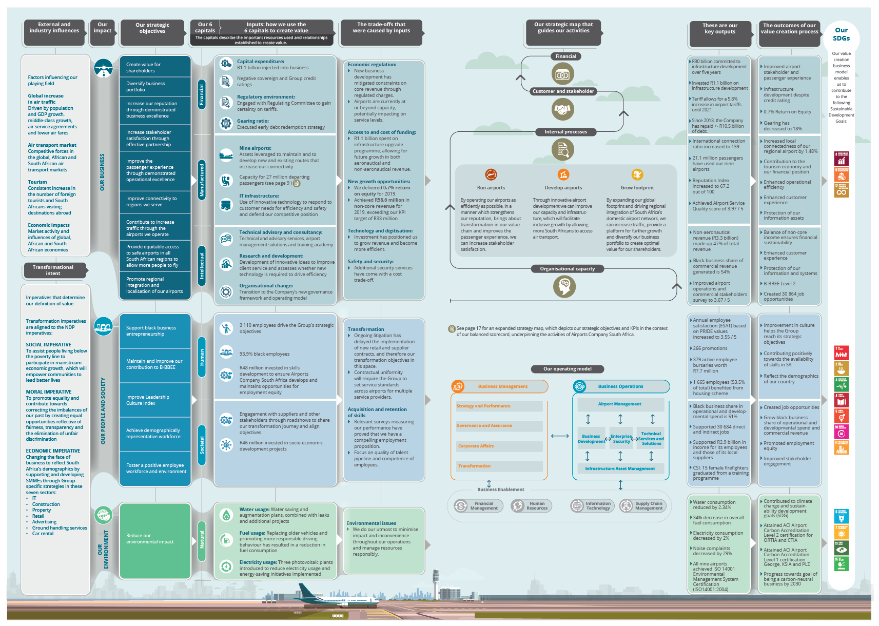 We apply an integrated approach to create value to deliver our outcomes, our country’s transformational objectives as well as global sustainability goals. Airports Company South Africa’s business model takes inputs from its capitals and transforms them through our business activities and interactions to produce outputs and outcomes that, over the short-, medium- and long-term, have the potential to create value for our business, our people, our society and the environment.”